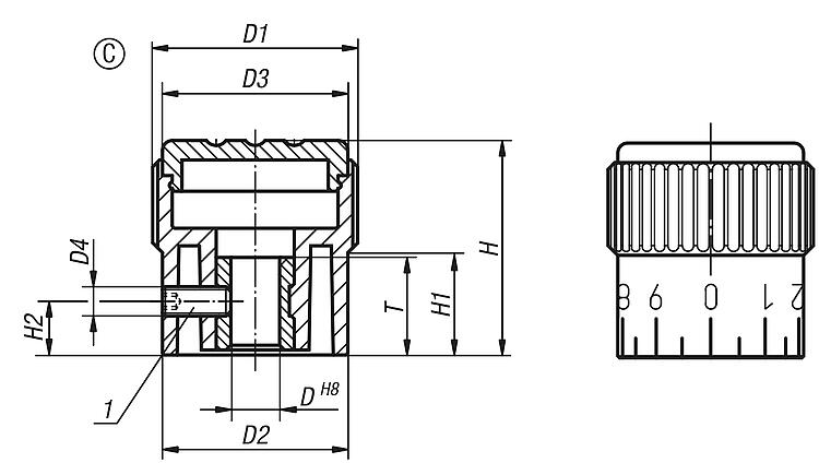 DescriptionMaterial:Thermoplastic, black grey. Bush steel.Version:Bush blue passivatedNote:Available without graduations, with one scale line or with 20 graduations and 10 digits.
