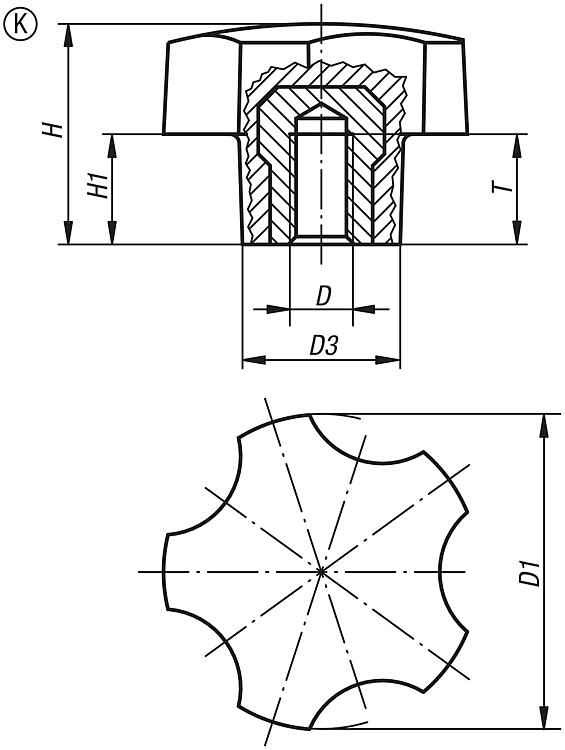 06850_IGFive lobe grips, plastic (thermoset), threaded insert steel,... |