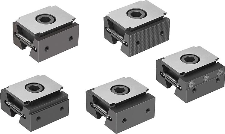 DescriptionProduct description:The functioning principle make the wedge clamps ideal for multi-clamping. The wedge shape creates high clamping forces. The wedge clamps can be used for clamping in conjunction with the clamping rail or mounted in tapped holes or T-slots. Tightening the clamping screw moves the two clamping segments outwards and press the workpieces against the fixed jaws of the machining fixture. The double wedge has an elongated hole allowing for movement and to compensate for tolerances. Displacement: M12 = ±1 mm, M16 = ±1.5 mm.Material:Double wedge and clamping segments mild steel.Version:Double wedge and clamping segments hardened, phosphated.Note:The two screw-on holes in the clamping faces also enable seating ledges to be mounted so as to optimise the clamping depth of the workpieces.Supplied withWedge clamps. Fastening screw.Drawing reference:Form A: Smooth jaw face Form B: Serrated jaw facet Form C: With step Form D: With machining allowance Form E: With jaw pins DownloadHere is all the information as a PDF datasheet: