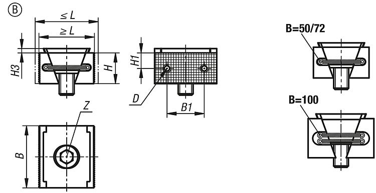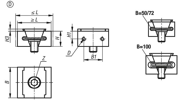 | Order No. | Form | Form definition | L min. | L max. | B | H | B1 | H1 | H3 | D Internal thread | Z cap screw DIN 912 | Clamping force max. kN | Tightening torque max. Nm | CAD | Acc. | Price | Order |
