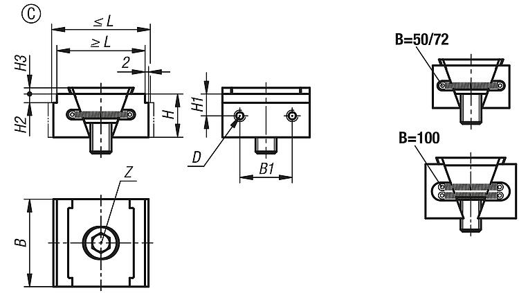 | Order No. | Form | Form definition | L min. | L max. | B | H | B1 | H1 | H2 | H3 | D Internal thread | Z cap screw DIN 912 | Clamping force max. kN | Tightening torque max. Nm | CAD | Acc. | Price | Order |