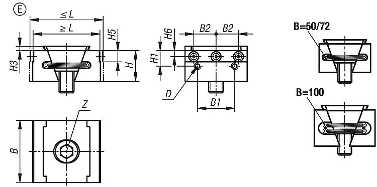 | Order No. | Form | Form definition | L min. | L max. | B | H | B1 | B2 | H1 | H3 | H4 | H5 | H6 | D Internal thread | Z cap screw DIN 912 | Clamping force max. kN | Tightening torque max. Nm | CAD | Acc. | Price | Order |