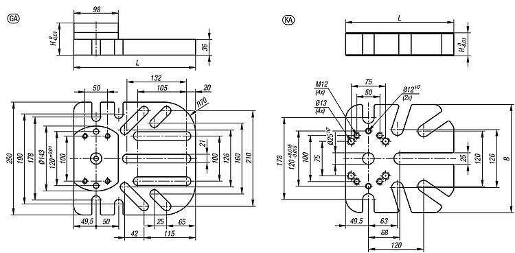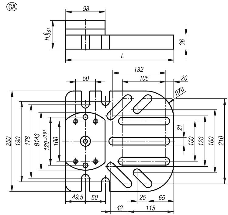 Note:The UNILOCK 5-axis baseplates for general clamping fit onto machine tables with grid hole systems or in T-slots, or onto grid hole tooling plates. Due to their robust construction, these elevated devices are ideal as a base supports for large and heavy workpieces. The arrangement of the fastening slots facilitates flexible adaptation to the workpiece and the machine table.