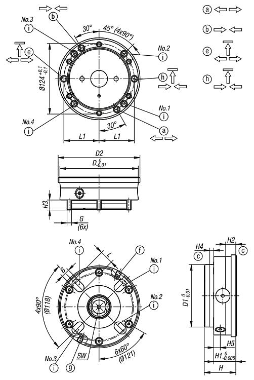 1) Connection and use of the turbo function in the base plate next to the "Open" port. This enables the clamping module to be additionally tensioned with a short air pulse if required. (recommended) 2) Simple hole in the baseplate connected to the turbo port to permit air to escape. Do not use a connection with a shut-off function to seal the hole against dirt, instead a venting screw should be used. 3) In the third case, the piston chamber must be vented via a bore that is connected below the baseplate via a transverse slot. This bore must join with the turbo port so that venting can take place. 4) If the clamping module is controlled from the side, the one vent screw must be inserted at this point.Supplied with- 1x clamping module. - 2x O-rings Ø9x1.5 for media feed. - 6x O-rings Ø9x1.5 for feedback function. - 6x fastening screws. - 6x cover caps for fastening screws.Drawing reference:1) Mounting contour