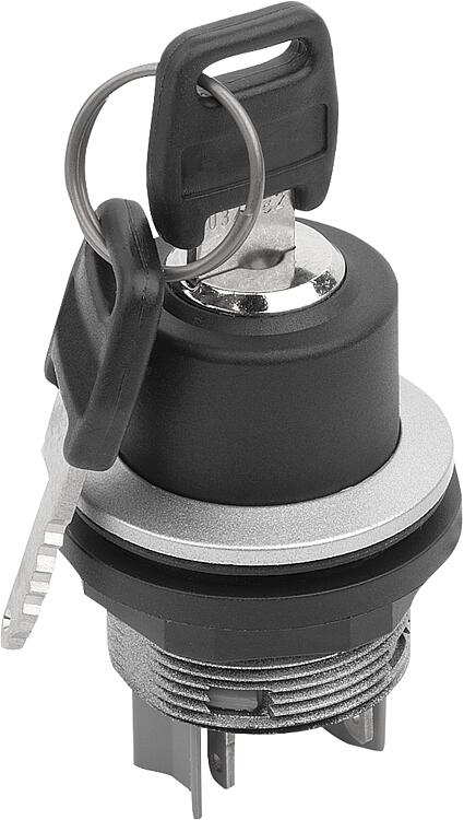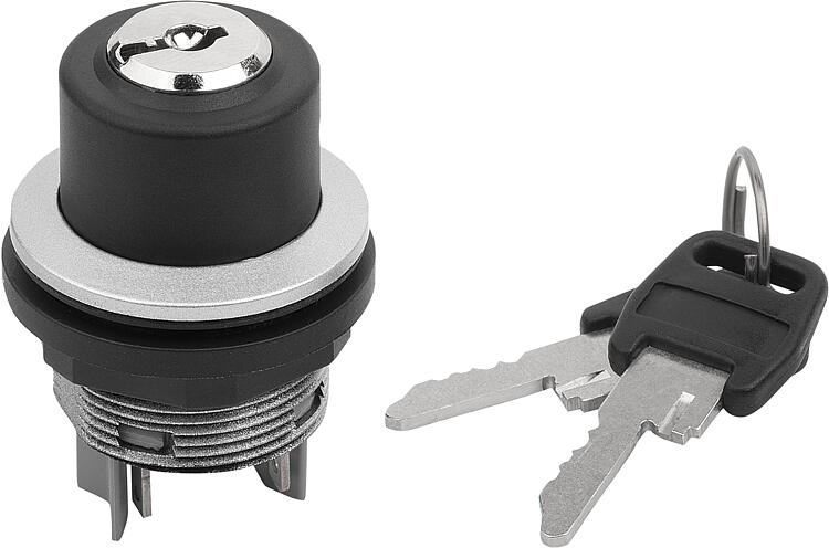 DescriptionMaterial:Plastic Contact terminals AgNi.Version:Selector switch black. Front frame silver.Note:Round lockable switch with integrated contactor and connections for flat tab plugs (use partially or fully insulated flat pin sockets). The lockable switches are each supplied with 2 keys. The locks have a single key system, i.e. each lock can be opened with the same key.