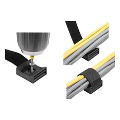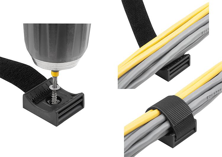 Note:The hook and loop fastener bracket serves as an installation aid for the damage-free securing of wires, cables and hoses. The bracket is already fitted with a hook and loop strip The hook and loop strip can be inserted and removed without tools. The hook and loop strip can be opened and fastened hundreds of times.