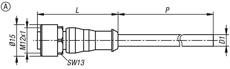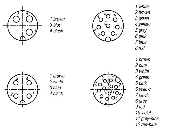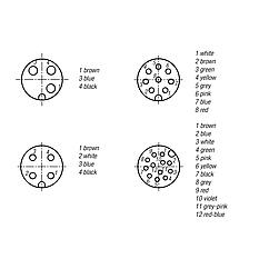 DescriptionMaterial:Housing: plastic. Cable: PUR (4 pole length 3 and 5 metres PVC. 8 pole length 10 metres PVC. 12 pole length 10 metres PVC). Insulation braid: PP (4 pole length 3 and 5 metres PVC. 8 pole length 10 metres PVC. 12 pole length 10 metres PVC). Contact: copper alloy. Contact surface: Au (gold). Lock: nickel plated die-cast zinc.Version:Bush (female). Housing colour: black. Cable colour: black.Note:Connector with screw lock. Connector moulded to cable. Wire ID acc. to DIN 47100 colour code. Coding A. Recommended tightening torque for the lock 0.6 Nm. The connectors are designed for use in plant, control and electrical appliance construction.Technical data:No. of connection cycles: ≥ 100. DownloadHere is all the information as a PDF datasheet: