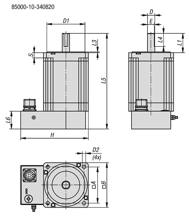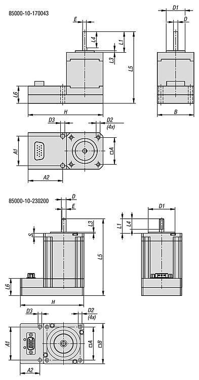 | Order No. | Size | A | A1 | A2 | B | D | D1 | D2 | D3 | E | H | L1 | L3 | L4 | L5 | L6 | S | Control voltage VDC | Motor voltage VDC | CAD | Acc. | Price | Order |