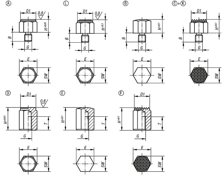 DescriptionMaterial:Steel.Version:Case-hardened and black oxidised.Note:Positioning feet are used as supports, stops and thrust pads for fixtures and general machine and appliance construction.Drawing reference:Form A: External thread and flat face Form B: External thread and convex face Form C: External thread and serrated face Form K: External thread and carbide serrated face Form L: External thread and POM insert Form D: External thread and flat face Form E: External thread and convex face Form F: External thread and serrated face DownloadHere is all the information as a PDF datasheet: