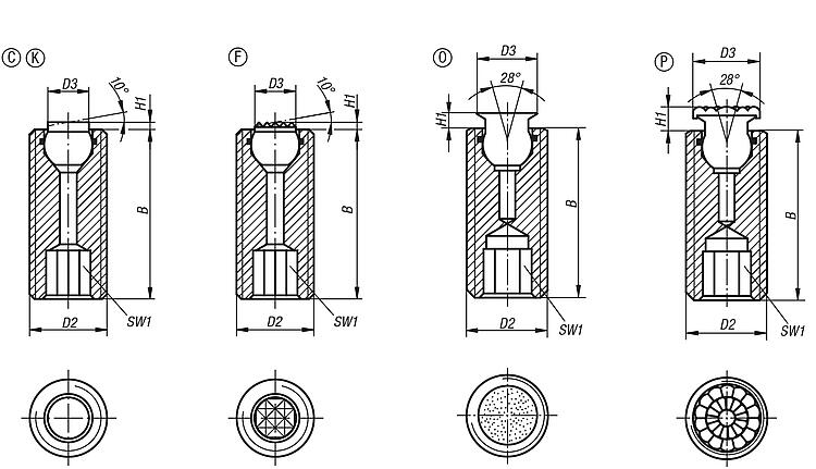 Form P: The polyurethane surface is vulcanised firmly to the ball. It is abrasion-resistant and does not discolour. Offers optimum protection against damage to delicate surfaces. The pearl-like surface gives a firm grip and allows air to escape so as to prevent any suction effect between the contact surface and the toggle locator.
