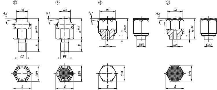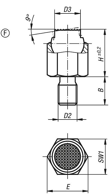 Form F: external thread, flattened ball, diamond grip
