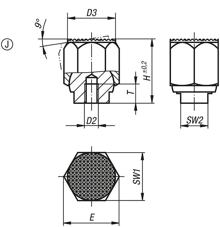 Self-aligning pads, auto-return, with hexagon, external thread, flattened serrated ball