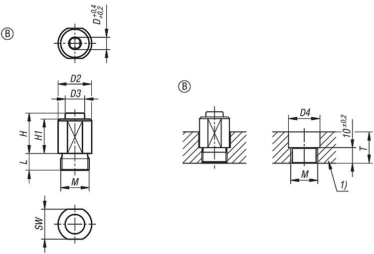 | Order No. | Form | Version 1 | D | D1 | D2 | D3 | H | H1 | H2 | L | M | SW | T | Holding force N | Clamping force N | Shearing force kN | Pullout force F kN | Temperature resistance | CAD | Acc. | Price | Order |