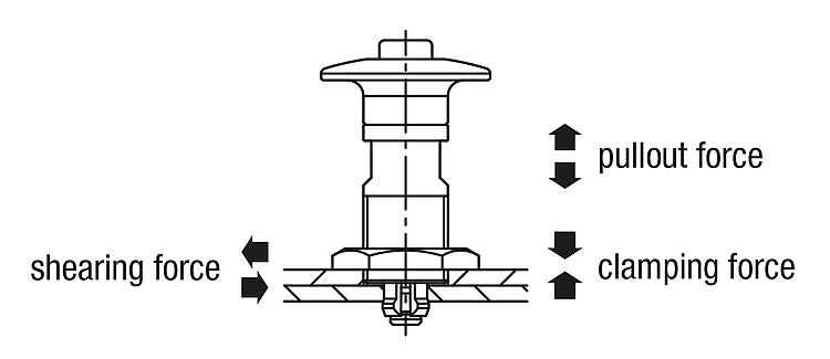A gap of more than 0.1 mm appears between the plates if the retaining force is exceeded.Type of operation:Screw the locking pin into the mounting plate until the thread can be seen on the other side. Press the knob and pass the clamping pin through the hole in the premachined baseplate. Screw the locking pin in the reverse direction till both plates come together, then secure with the locknut.Drawing reference:1) Mounting plate 2) Base plate Special features: DownloadHere is all the information as a PDF datasheet: