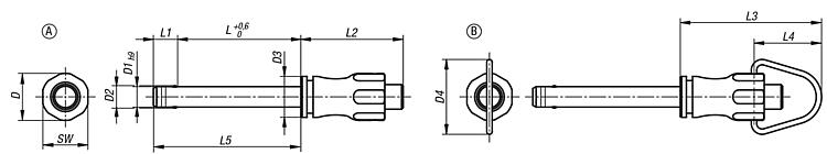 | Order No. | Form | D | D1 | D2 | D3 | D4 | L | L1 | L2 | L3 | L4 | L5 | SW | Receiving hole H11 | Shearing force double shear max.kN | CAD | Acc. | Price | Order |