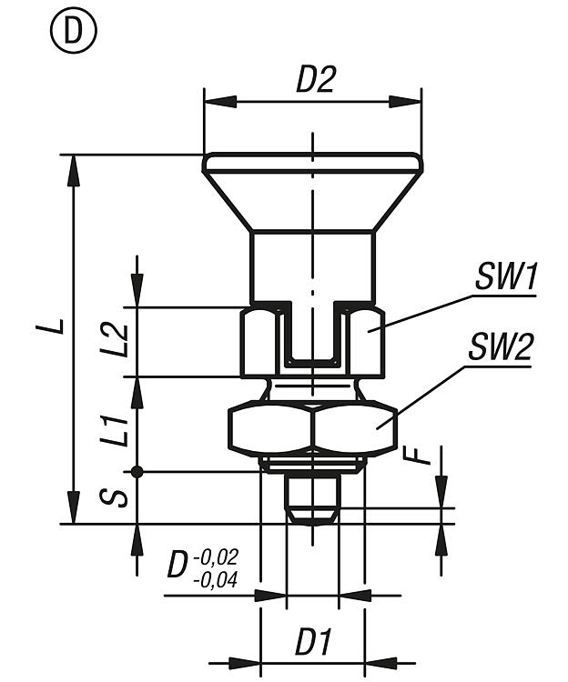 | locating pin | D | D1 | D2 | L | L1 | L2 | Travel S | SW1 | SW2 | Fx30° | Spring force initial pressure F1 approx. N | Spring force final pressure F2 approx. N | CAD | Acc. | Price | Order |
