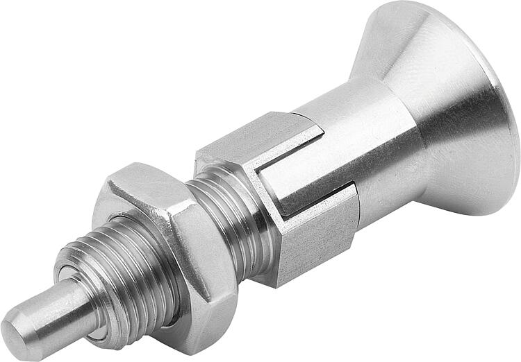 Threaded sleeve, mushroom grip and indexing pin 1.4404. Version:Stainless steel version A1: Threaded sleeve and mushroom grip bright. Indexing pin hardened and ground, bright. Indexing pin not hardened and ground, bright.