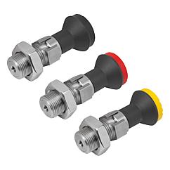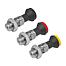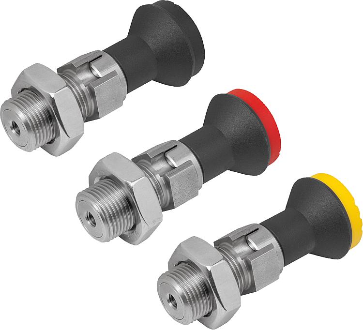 Actuating elements for indexing plungers with remote actuation, with plastic mushroom grip, locking slot and locknut