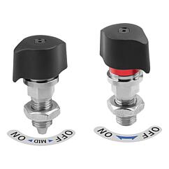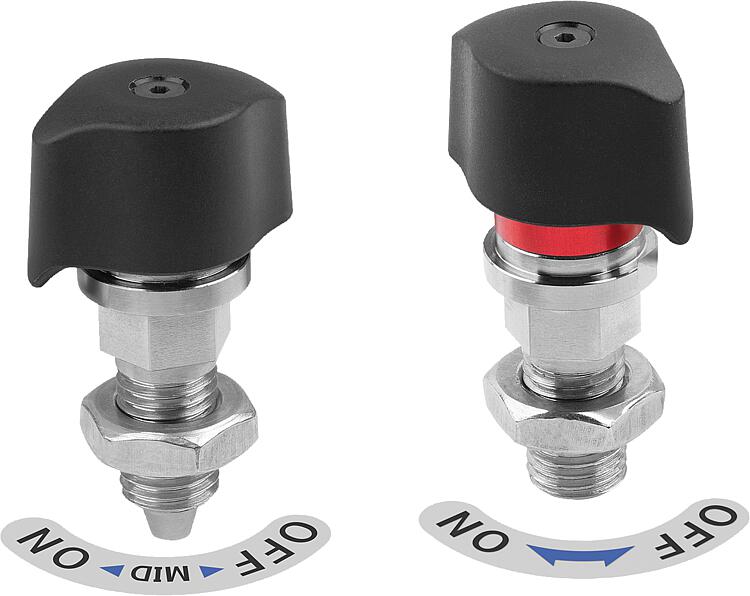If the locked mark is visible, the pin is either completely retracted or only partly in the indexed position. Material:Housing and pin steel. Locked mark and label aluminum. Twist knob thermoplastic PA (polyamide)Version:Housing and pin nickel plated. Locked mark anodised, red. Twist knob fiberglass reinforced, black.Type of operation:Style A: Check that the twist knob is in the "OFF" position and that the pin is retracted. Slide the plate with the bushing under the indexing plunger. To clamp, turn the twist knob to the "ON" position. When fully clamped, an audible click will be heard. Caution: Do not loosen the clamping of the indexing plunger when the pin is under an axial load. Due to the conical shape, the pin may not retract.