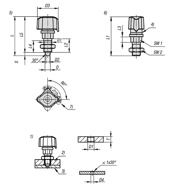 Style B: With the twist knob in the "OFF" position, slide the plate with the bushing towards the indexing plunger until the spring locks the pin into the bushing. The twist knob will move automatically the the "MID" position. For complete clamping, turn the twist knob from the "MID" position to the "ON" position until a click signal is heard.Accessory:Bush 03096-44.Supplied withA locknut and a 0.2 mm thick label are supplied.Drawing reference:1) Installation without bushing 03096-44 2) Mounting plate 3) Base plate 4) Locked mark 5) ON position 6) OFF position 7) Label Special features: DownloadHere is all the information as a PDF datasheet: