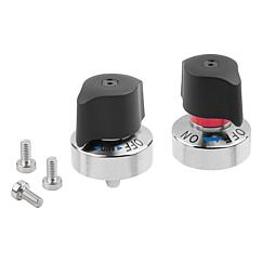 If the locked mark is visible, the pin is either completely retracted or only partly in the indexed position. Material:Housing and pin steel. Locked mark. Twist knob thermoplastic PA (polyamide)Version:Housing and pin nickel plated. Locked mark anodised, red. Twist knob fiberglass reinforced, black.Note:Mounting option 1 for plate thickness 6 mm. Mounting option 2 by Form A for plate thickness > 6 up to 14 mm and by Form B for plate thickness > 6 up to 15 mm. Type of operation:Style A: Check that the twist knob is in the "OFF" position and that the pin is retracted. Slide the plate with the bushing under the indexing plunger. To clamp, turn the twist knob to the "ON" position. When fully clamped, an audible click will be heard. Caution: Do not loosen the clamping of the indexing plunger when the pin is under an axial load. Due to the conical shape, the pin may not retract.
