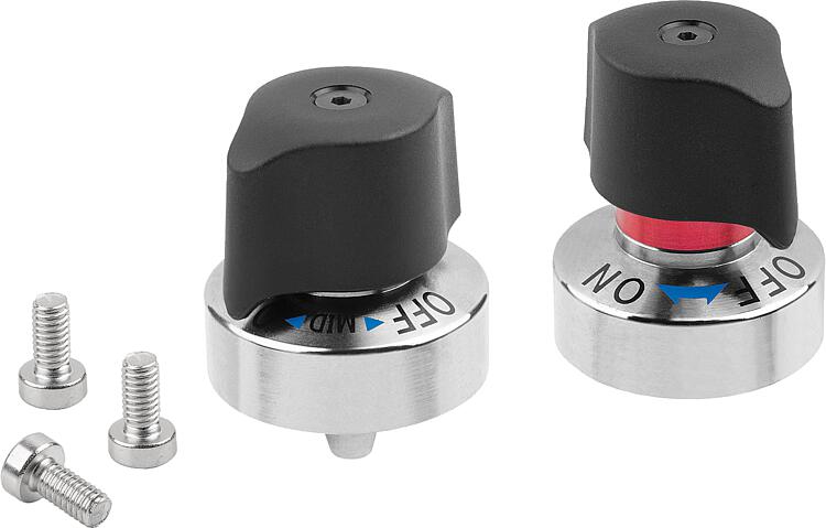Style B: With the twist knob in the "OFF" position, slide the plate with the bushing towards the indexing plunger until the spring locks the pin into the bushing. The twist knob will move automatically the the "MID" position. For complete clamping, turn the twist knob from the "MID" position to the "ON" position until a click signal is heard.Accessory:Bush 03096-44.Supplied withFastening screws are supplied.Drawing reference:1) Mounting option 1 2) Mounting option 2 3) Plate 4) ON position 5) OFF position 6) Locked mark Special features: DownloadHere is all the information as a PDF datasheet: