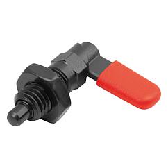 DescriptionProduct description:Cam-action indexing plunger are used where any change in locking position due to lateral forces should be prevented. Turning the grip through 180° retracts the indexing pin, enabling a change in the indexed position. The notch ensures that the grip remains in this position and the indexing pin remains retracted. A stop at 180° prevents the lever rotating further and the indexing pin from extending again. The rotation direction is defined by selecting a left or right stop side.Material:Grip 1.0503. Threaded sleeve and indexing pin free-cutting steel. Spring 1.4310. Grip cap thermoplastic PA.Version:Threaded sleeve and grip black oxidised. Indexing pin hardened, ground and black oxidised. Spring bright. Grip cap in various colours: - black grey RAL 7021 - pure orange RAL 2004 - colza yellow RAL 1021 - traffic red RAL 3020 - signal green RAL 6032 - traffic blue RAL 5017 - light grey RAL 7035Advantages:Turning the grip through 180° retracts the pin. Optionally available with coloured plastic grip caps. 180° stop with rotation in one direction.On request:Special versions. Accessory:Mounting bracket 03099. Positioning bushes 03099-50, 03099-60, 03099-61. Drawing reference:1) Stop, left 2) Stop, right Special features: DownloadHere is all the information as a PDF datasheet: