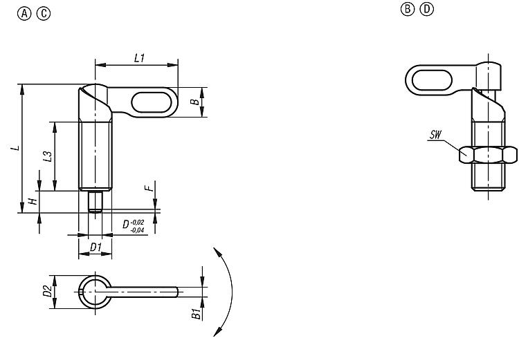 DescriptionMaterial:Steel grade 5.8.Version:Black oxidised. Pin hardened and ground.Note:Cam-action indexing plungers are used when the indexing pin should not project all the time. Turning the handle through 180° retracts the pin and a notch ensures that the handle remains in this position. Drawing reference:Form A: grip uncoated without nut Form C: grip powder-coated without nut Form B: grip uncoated with nut Form D: grip powder-coated with nut Special features: DownloadHere is all the information as a PDF datasheet: