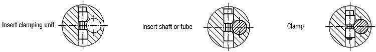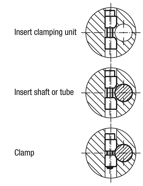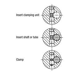 Screw grade 8.8.Version:Jaws black oxidised. Screw blue electro zinc-plated.Note:These shaft clamping units are the simple alternative to conventional shaft clamping (slot and grub screw). The units are suitable for various materials (metal, plastic, wood etc). To loosen a jammed clamp simply hit it axially or extract it using a screw in the jaw end or screw head.Special features: DownloadHere is all the information as a PDF datasheet: