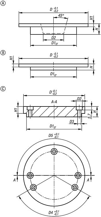 DescriptionMaterial:Centring flange QT steel 1.1191 or 1.1192.Note:The centring flange with bore is a high-quality component that can be used in tool and die making. This centring flange has a precise shoulder that facilitates easy alignment and positioning of tools or dies. The conical bore of the flange provides excellent guidance and ensures a secure connection between different parts.