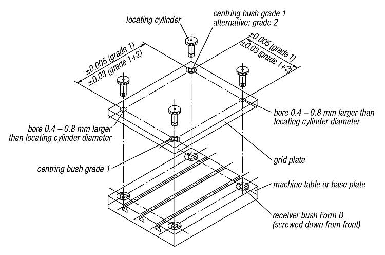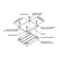 DescriptionMaterial:Stainless steel 1.4548. Version:Hardened to min. 40 HRC, bright.Note:By a centre distance tolerance of ±0.005 mm and two grade I centring bushes a repeat accuracy of ±0.013 mm is possible. By a centre distance tolerance of ±0.03 mm and one grade I and one grade II centring bush a repeat accuracy of 0.04 mm is possible. The centring bushes are pressed into the receiver holes of the tooling plates using a light pressure. For further details see “General information”.Special features: DownloadHere is all the information as a PDF datasheet: