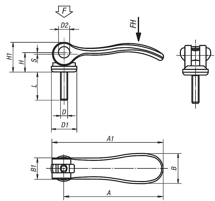 | Order No. | Component material | Main colour | D | D1 | D2 | B | B1 | H | H1 | A | A1 | Travel S | Clamping force F (kN) | Hand force FH N | CAD | Acc. | Price | Order |