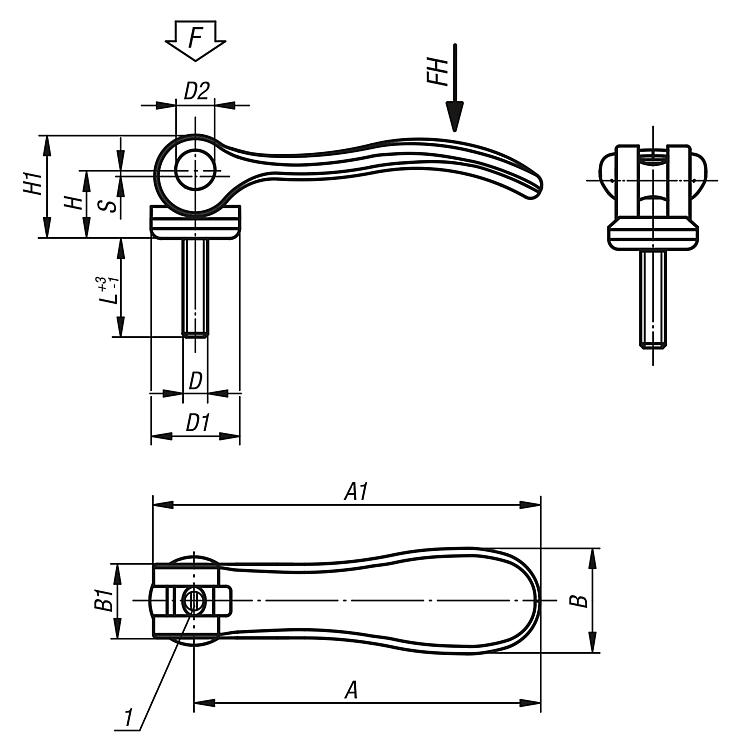 Hinge pin, washer and screw 1.4305 stainless steel. Version:Handle electropolished or blasted. Thrust washer black. Hinge pin, washer and screw bright.Note:Adjustable cam levers are used if the position of the lever relative to the axis of tension only permits one specific position (interference circle). The exact position of the lever is adjusted using a screwdriver on the fine thread setscrew. Plastics are subject to creeping under load (retardation).Drawing reference:1) setscrew for fine adjustment of lever Special features: DownloadHere is all the information as a PDF datasheet: