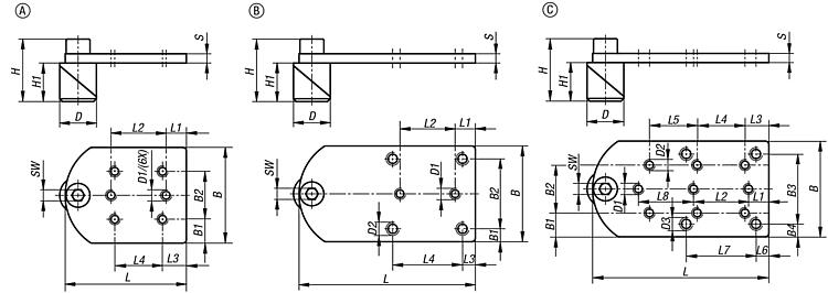 Note:The adapter plates enable the toggle clamp to be compatible with hole pattern 3 or 4, for hole grid plates or plates with Ø16 mm, Ø20 mm or Ø28 mm holes.