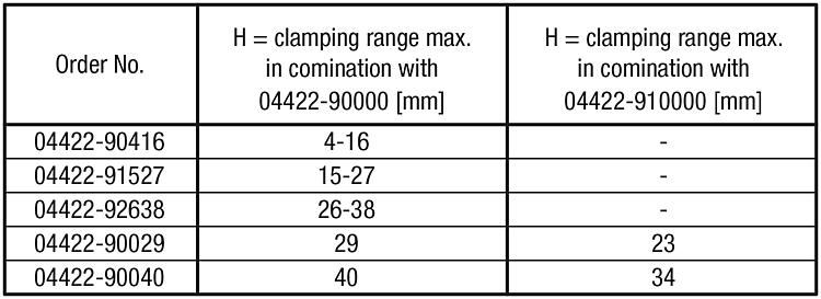 | 04422-90416 | C | exchange upper jaw | 28 | 15 | 4-16 | 24,5 | 3,5 | 29,5 | 11,5 |  | | on request | | | 04422-91527 | C | exchange upper jaw | 28 | 15 | 15-27 | 24,5 | 14,5 | 29,5 | 11,5 |  | | on request | | | 04422-92638 | C | exchange upper jaw | 28 | 15 | 26-38 | 35,5 | 25,5 | 29,5 | 11,5 |  | | on request | |