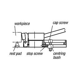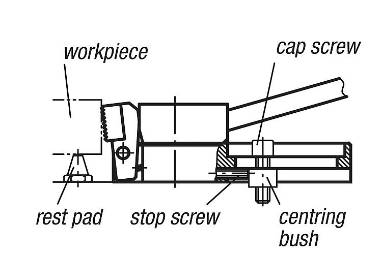 DescriptionMaterial:Steel.Version:Case-hardened and black oxidised.Note:This is a quick-action side clamp where workpieces are clamped by rotating a cam wheel which exerts pressure on the swivel jaw, simultaneously producing a positive down force. Using the stop screw and centring bush (see diagram), the side clamp can be mounted and positioned on a modular grid system.