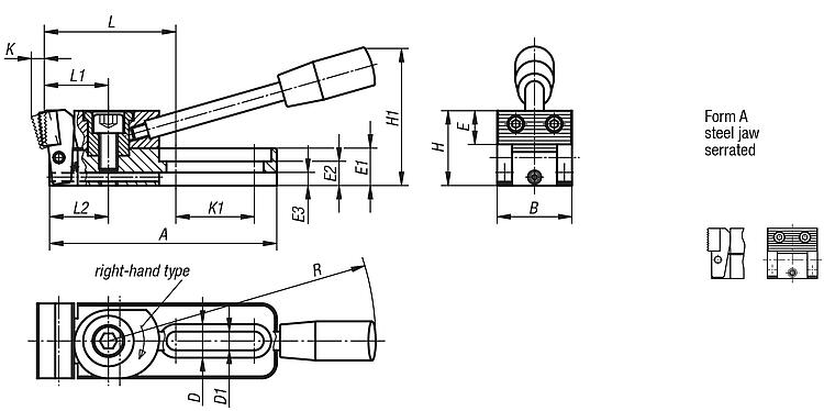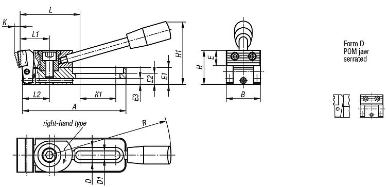 Side clamps, steel with tension lever and slotted hole, serrated POM jaw |