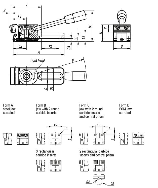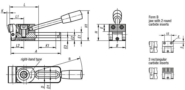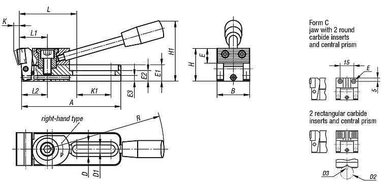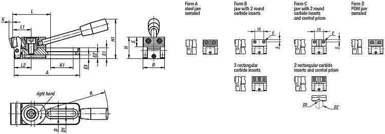 Side clamps, steel with tension lever and slotted hole, jaw with two carbide inserts, round and prism |