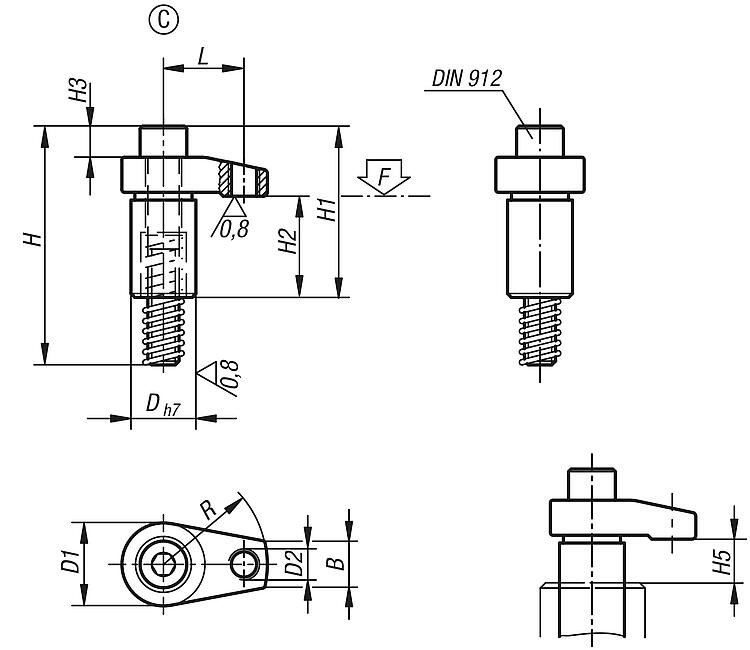 | Order No. | Form | D | D1 | H | H1 | H2 | H3 | H4 | H5 max. clamping range | B | R | Socket head screw DIN 912 | Tightening torque max. Nm | F max. kN | CAD | Acc. | Price | Order |