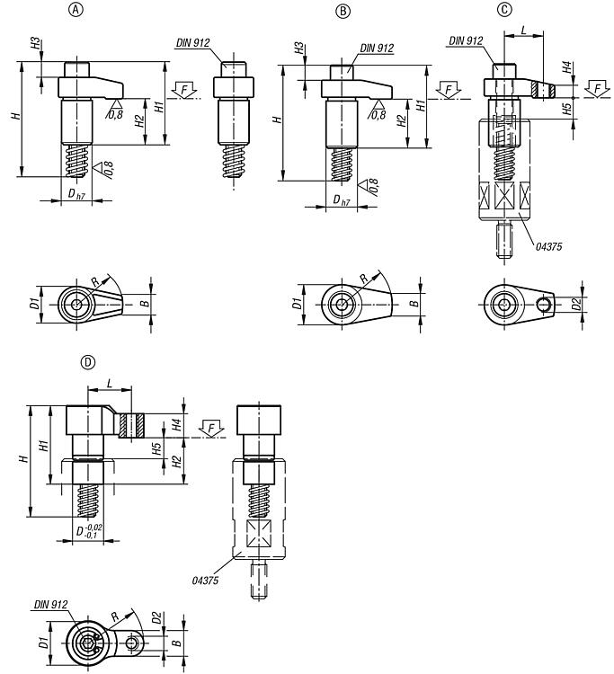 DescriptionMaterial:Carbon steel, tempered.Version:Form A-C: black oxidised. Shaft diameter ground. Form D: black oxidised.Note:The stated clamping forces (F max.) and tightening torques are valid within the stated clamping ranges (H5).Advantages:Compact design for use in the tightest of spaces Diverse versions and sizesAccessory:Hook clamp holders 04375. Hook clamp holders 04379. Extensions for jack screws 04378.Special features: DownloadHere is all the information as a PDF datasheet: