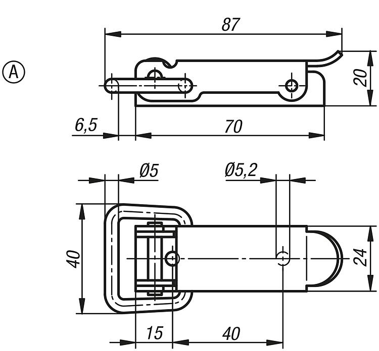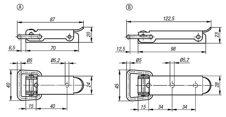 Latches, steel or stainless steel, with draw bail, fastening holes concealed, Form A