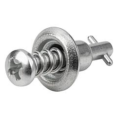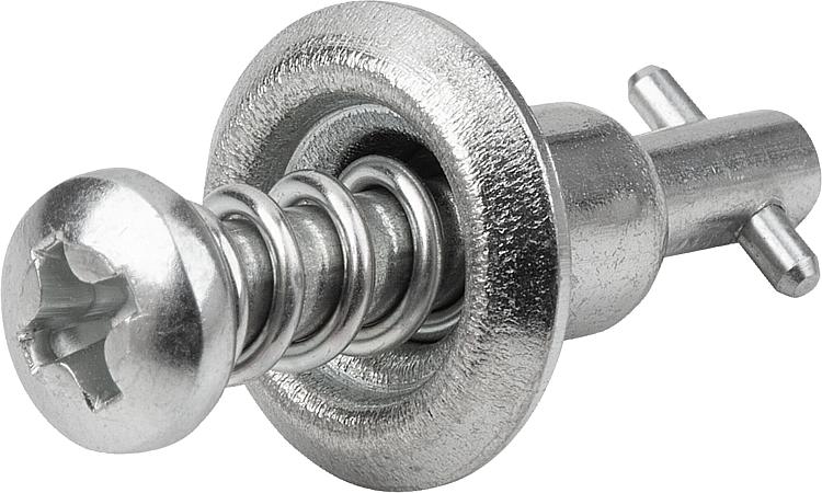DescriptionMaterial:Steel.Version:Electro zinc-plated.Note:Quarter-turn latches for securely holding and locking hatches, container lids, machine covers and similar. The lock is closed or opened by turning it through 90°. This moves the cross pin in the locking bolt through a curve in the bottom part of the lock, thus tensioning the spring. At the end point of the curve there is a little recess in which the cross pin engages. The pretensioning force generated in the lock by the spring ensures that the connection is held securely despite any vibrations.