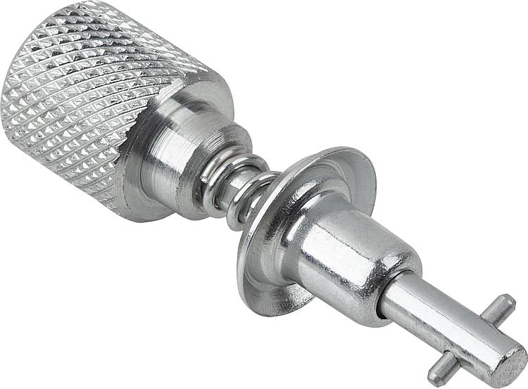 DescriptionMaterial:Steel.Version:Electro zinc-plated.Note:Quarter-turn latches for securely holding and locking hatches, container lids, machine covers and similar. The lock is closed or opened by turning it through 90°. This moves the cross pin in the locking bolt through a curve in the bottom part of the lock, thus tensioning the spring. At the end point of the curve there is a little recess in which the cross pin engages. The pretensioning force generated in the lock by the spring ensures that the connection is held securely despite any vibrations.