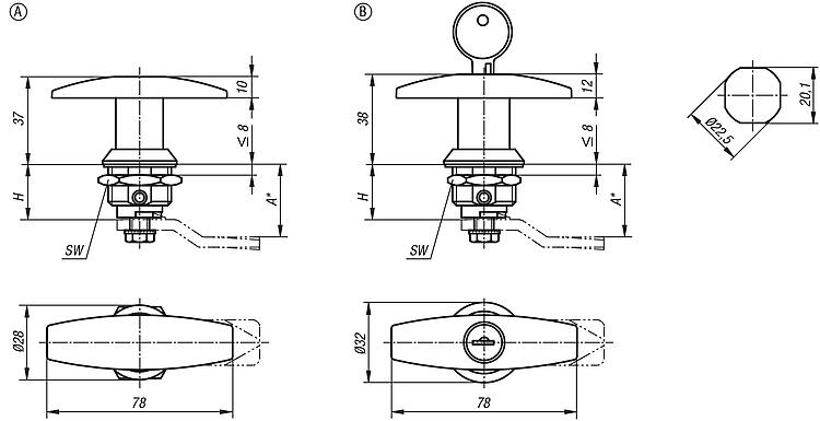 *Dimension A results from the combination of the quarter turn lock and the tongue and is specified with the matching tongues.
