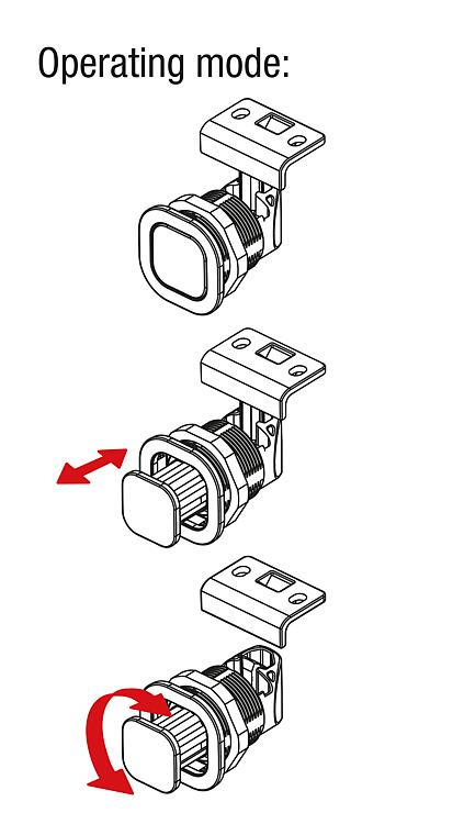 Type of operation:When not actuated, the knob is flush with the housing. When the knob is pressed, it springs out and can be used to retract the latch by twisting to the left or right. The door latches automatically when pushed shut. Press the knob in again to make it flush with the housing.Application:- Automobile industry