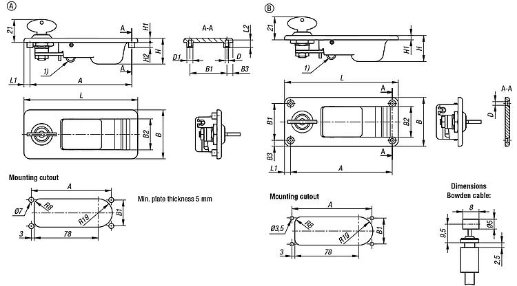 DescriptionMaterial:Grip and housing die-cast zinc.Version:Grip and housing powder-coated black or silver.Note:When the grip is actuated, hatches, lids, covers or doors are opened remotely and invisibly via a Bowden cable. The lockable releases are each supplied with 2 keys. The key can be removed in both positions (open and closed). The locks have a single key system, i.e. each lock can be opened with the same key. The Bowden cable and fastening screws are not supplied.Application:The remote actuation is used where tight spaces make actuation difficult or where remote actuation is required for ergonomic or safety reasons.Assembly:Form A: From the rear using self-tapping M3 screws. Form B: From the front.Advantages:Actuation possible in inaccessible assembly spaces. Ergonomically optimised actuating position possible. Actuation possible even when safety distances are required.Accessory:Bowden cable 05596-01Drawing reference:Special features: DownloadHere is all the information as a PDF datasheet: