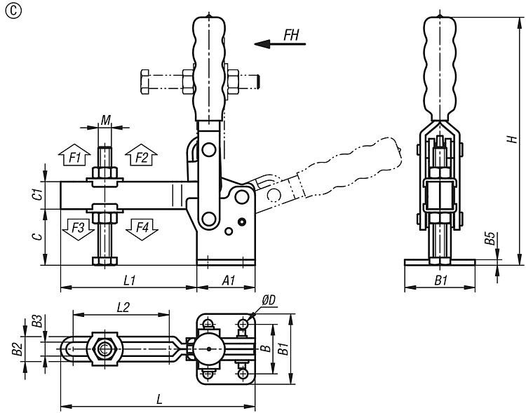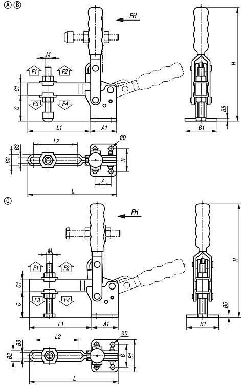 | Order No. | Form | A | A1 | B | B1 | B2 | B3 | B5 | C | C1 | D | H | Retaining force F1 N | Retaining force F2 N | Hand force FH N | L | L1 | L2 | CAD | Acc. | Price | Order |