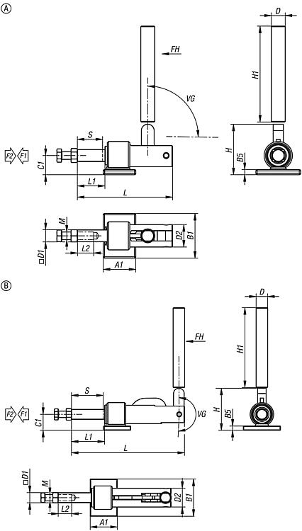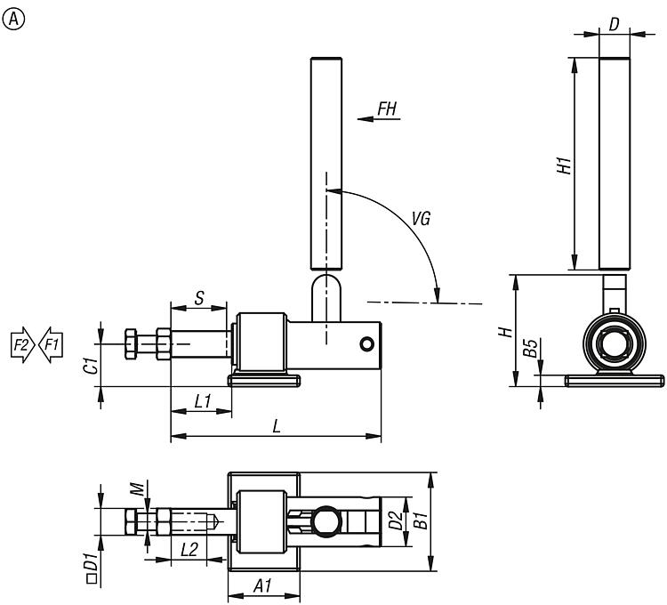| Order No. | Form | A1 | B1 | B5 | C1 | D | D1 | D2 | H | H1 | Travel S | L=Length | L1 | L2 | M | Opening angle of handle | Hand force FH N | Clamping force F1 N | Retaining force F2 N | CAD | Acc. | Price | Order |