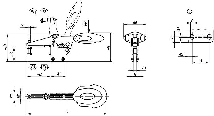 | Order No. | hole arrangement | Opening angle of holding arm | Opening angle of handle | Hand force FH N | Retaining force F1 N | Retaining force F2 N | Clamping force F3 N | Clamping force F4 N | CAD | Acc. | Price | Order |
