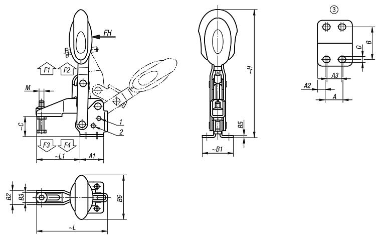 Datasheet 05908 Toggle clamps vertical with safety interlock with flat foot and adjustable clamping spindle, stainless steel 277 kB